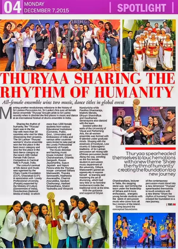 In November 2015, Thuryaa, Sri Lanka’s first all-female traditional drumming ensemble, proudly embarked on its first international tour—a defining moment in the group’s history and a breakthrough for Sri Lankan performing arts. The destination was Punjab, India, where Thuryaa represented Sri Lanka at the prestigious 18th Global Female Folk Dance Competition & Carnival, organized by the Charu Castle Foundation (CCF) in partnership with Lovely Professional University.