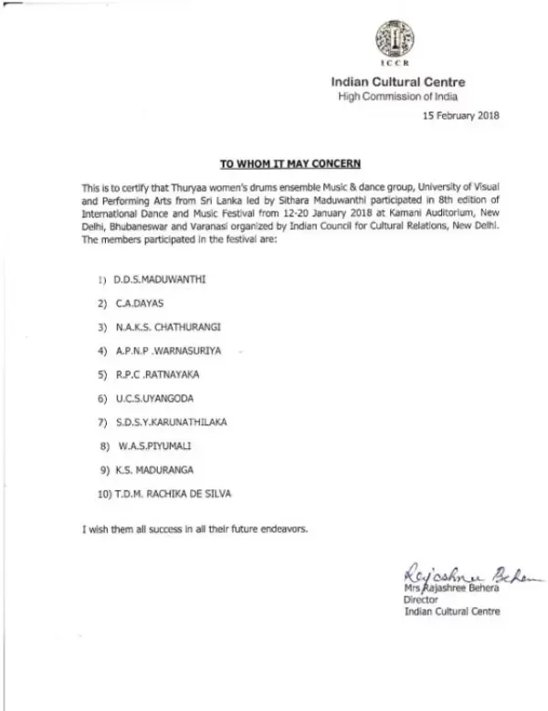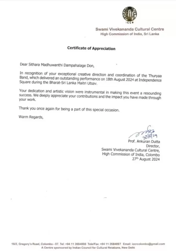 The letter praised her artistic vision, coordination, and leadership, which were key to the success of the event. Sithara’s work was described as instrumental in making the performance a resounding success and a meaningful celebration of cultural friendship between India and Sri Lanka.