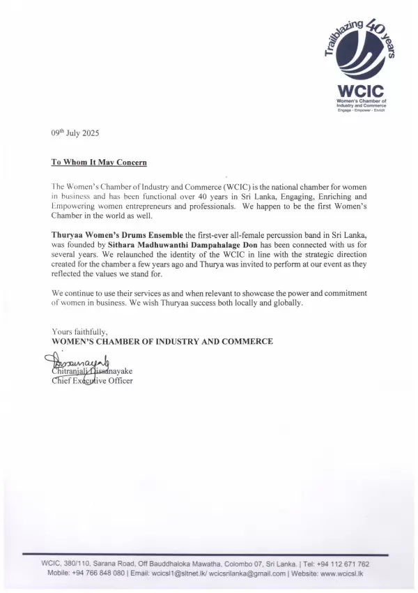 In a letter dated 9th July 2025, WCIC acknowledged Thuryaa Women’s Drums Ensemble as a symbol of female strength, cultural innovation, and leadership. The ensemble, founded by Sithara, was praised for its long-standing partnership with the Chamber and for its role in representing the values WCIC stands for.