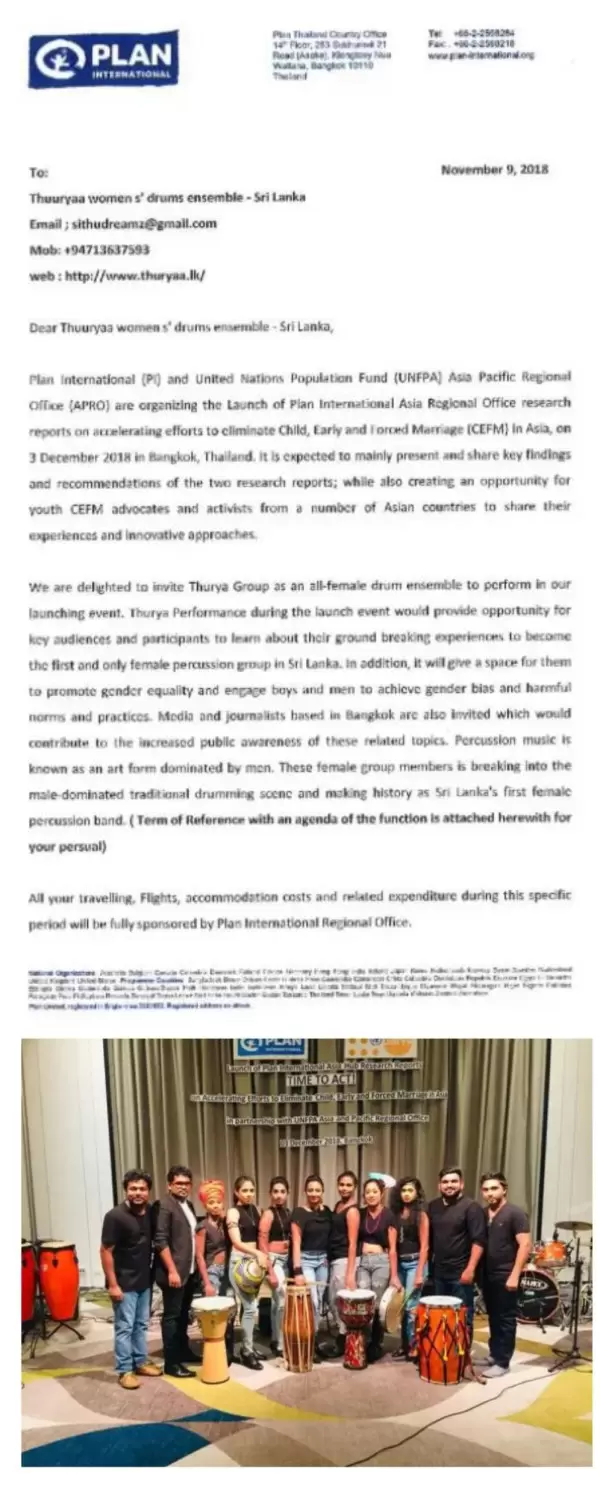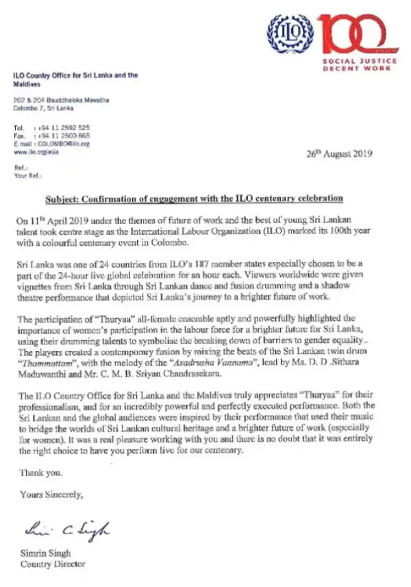Led by Sithara, Thuryaa performed as Sri Lanka’s all-female percussion ensemble—representing the University of Visual and Performing Arts at this major international cultural event. The letter recognizes not only the ensemble’s musical excellence but also the leadership and artistic direction that brought the team to this platform.