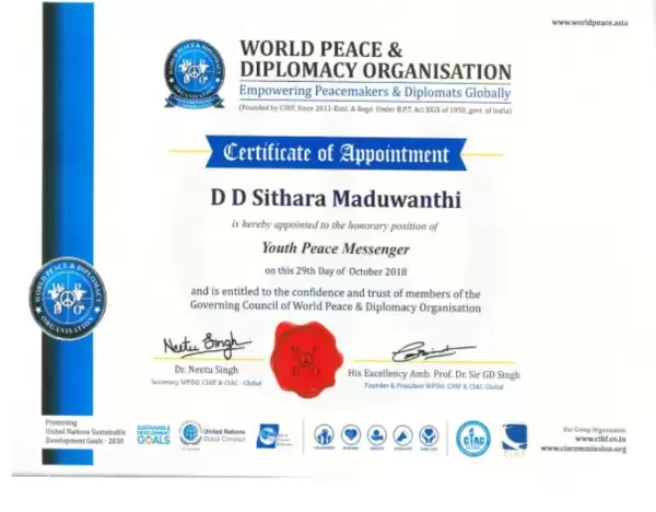 This honorary title was awarded in recognition of her contributions toward peace, cultural diplomacy, and empowering women through the arts. The appointment reflects the confidence and trust placed in her by the Governing Council of WPDO, an organization aligned with promoting the United Nations Sustainable Development Goals (SDGs), particularly around peace, gender equality, and youth empowerment.